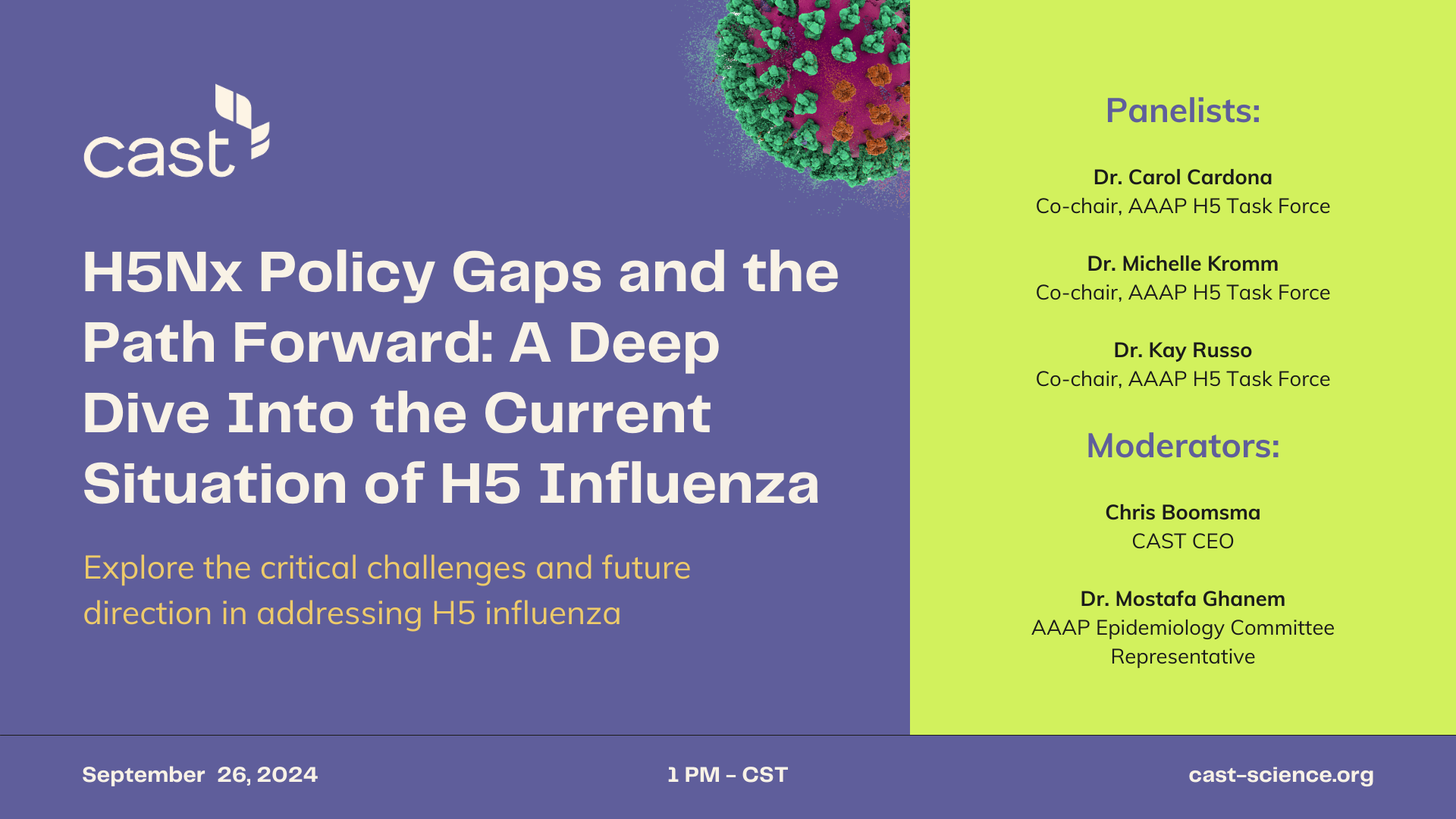 Target Audience: This webinar is designed for veterinarians, epidemiologists, poultry industry stakeholders, public health officials, and policymakers who are involved in or concerned with the management of H5 influenza and its broader implications.
